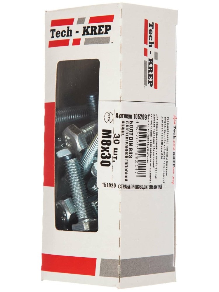 Болт оцинкованный М8х30 с шестигранной головкой DIN 933 от Tech-Krep, 30 шт в коробке с окном. Прочный, устойчивый к коррозии крепеж для строительства и ремонта.