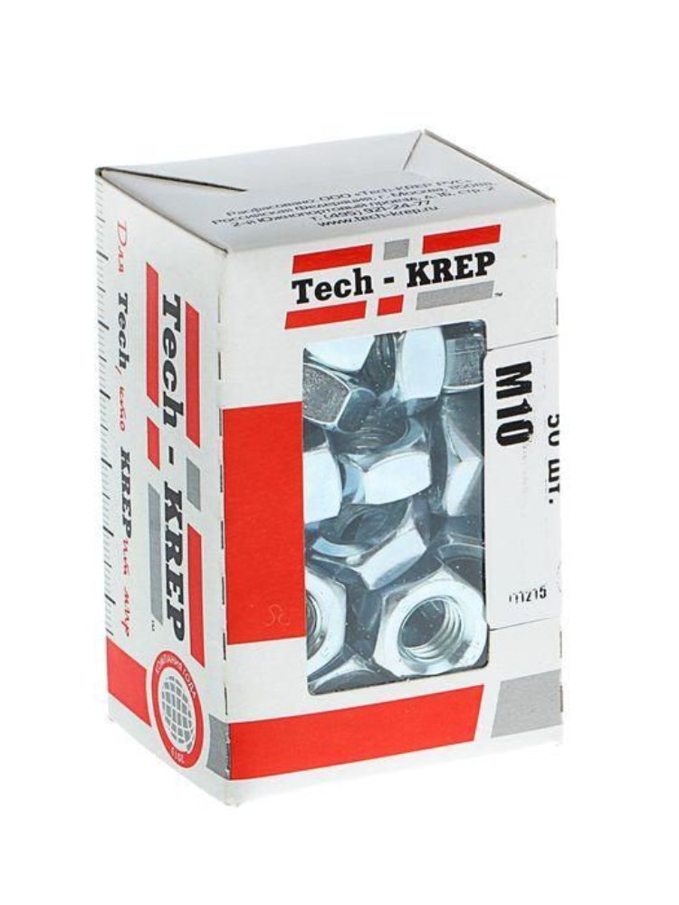 Шестигранная гайка М10 DIN934 с цинковым покрытием, 50 шт. в коробке с окном Tech-Krep. Прочная, антикоррозийная, для надежного крепления.