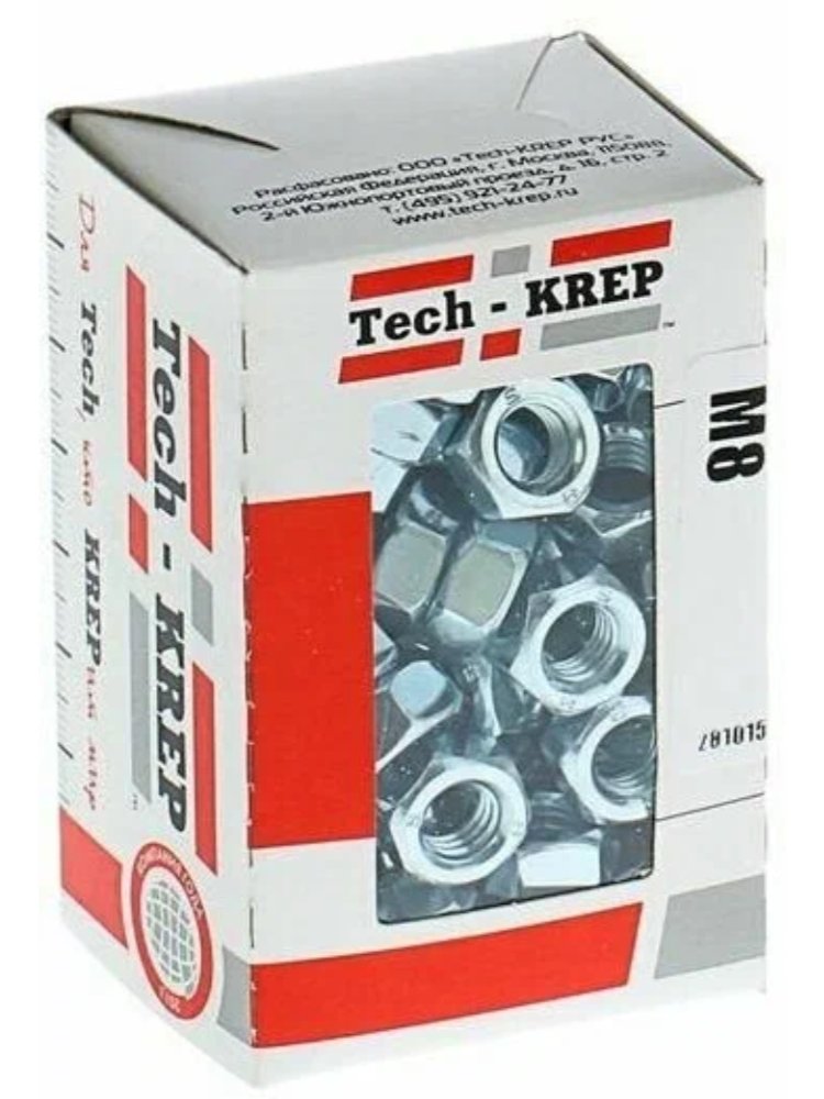 Гайка шестигранная оцинкованная М8 DIN 934 от Tech-Krep, 100 шт. в коробке с окном. Прочный крепеж из стали с защитой от коррозии для надежных соединений.
