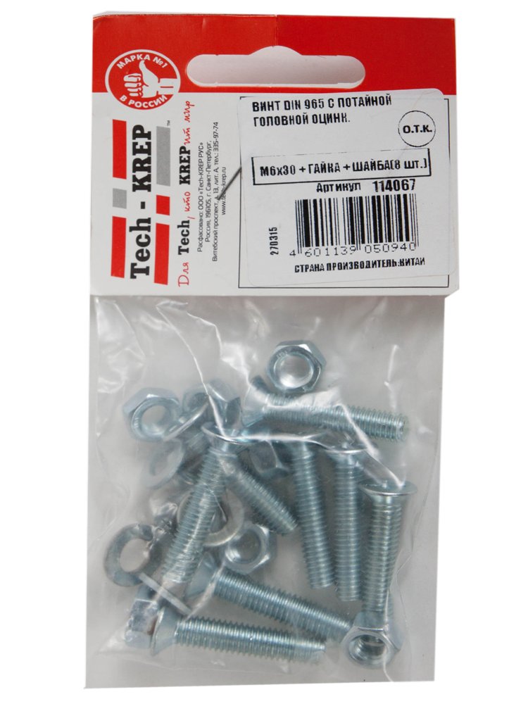 Винт DIN965 с потайной головкой оцинк. M6х30 + гайка + шайба (8 шт) - пакет Tech-Krep