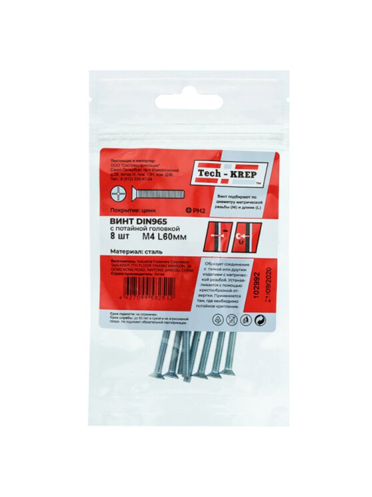Винт DIN965 с потайной головкой, оцинкованный, М4х60, 8 шт. в упаковке Tech-Krep. Прочный, коррозиестойкий, для аккуратного крепления.