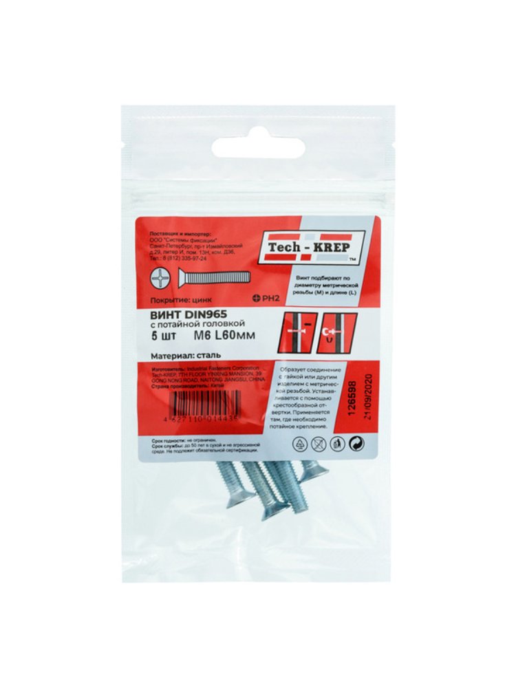 Винт с потайной головкой DIN965, оцинкованный, размером М5х60, поставляется в упаковке по 6 штук от бренда Tech-Krep. Изготовлен из прочной углеродистой стали с цинковым покрытием, что обеспечивает надежную защиту от коррозии и увеличивает срок службы крепежа. Конструкция с потайной головкой позволяет создавать аккуратные соединения, где головка винта полностью утапливается в материал, обеспечивая эстетичный вид и безопасность. Используется с крестообразным шлицем PH2, что гарантирует удобство и прочность закручивания. Подходит для работы с различными материалами, такими как дерево, металл или пластик, при условии использования соответствующих дюбелей или гаек.