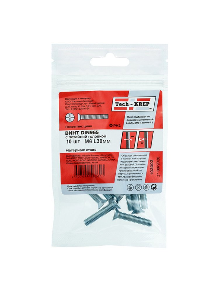 Винт с потайной головкой оцинкованный М6х30 в упаковке из 10 штук от бренда Tech-Krep соответствует стандарту DIN 965, что гарантирует высокое качество и точность размеров. Изготовлен из углеродистой стали с цинковым покрытием, которое обеспечивает надежную защиту от коррозии даже в условиях повышенной влажности. Потайная головка позволяет устанавливать винт заподлицо с поверхностью, что делает соединение более эстетичным и безопасным. Диаметр резьбы составляет 6 мм, длина — 30 мм, что подходит для различных монтажных задач. Винт предназначен для использования с гайками и шайбами соответствующего размера, а также для крепления в заранее подготовленные отверстия.