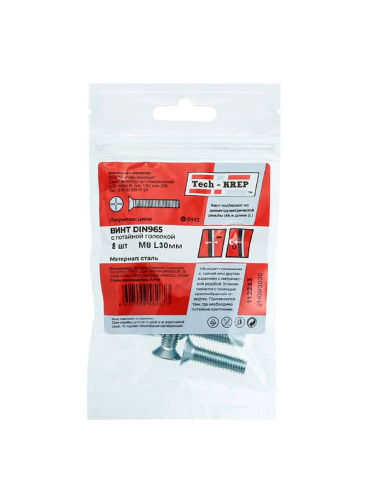 Винт с потайной головкой DIN965, размером M8х30, в упаковке 8 штук от Tech-Krep изготовлен из прочной стали с оцинкованным покрытием, что обеспечивает надежность и долговечность крепления. Потайная головка позволяет устанавливать винт заподлицо с поверхностью, что идеально подходит для создания эстетичного и аккуратного соединения. Подходит для использования с гайками, шайбами и другими крепежными элементами соответствующего размера. Винт прост в установке и обеспечивает прочное крепление даже при высоких нагрузках.