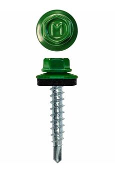 Стальные саморезы с шестигранной со сверловидным наконечником, укомплектованные шайбой с резинкой, для крепления кровельных материалов к деревянной обрещетки. Крепкий зеленый саморез 4,8x35 мм с шайбой и уплотнением для надежной фиксации кровли, не ржавеет и выдерживает любые погодные условия.
