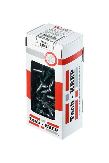 Саморез кровельный 4,8х51 мм в цвете RAL-6005 (зеленый) от Tech-Krep предназначен для крепления кровельных материалов к металлическим или деревянным конструкциям. Изготовлен из прочной углеродистой стали с антикоррозийным цинковым покрытием, что обеспечивает долговечность даже в условиях повышенной влажности. Шестигранная головка с пресс-шайбой и EPDM-прокладкой гарантирует герметичность соединения и защиту от протечек. В упаковке 60 штук, что удобно для небольших и средних объемов работ. Коробка с окном позволяет легко оценить содержимое без вскрытия.