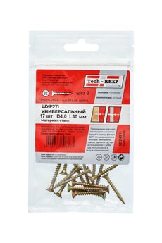 Комплект: 16 универсальных саморезов 4×50 мм с антикоррозийным покрытием и дюбелями 6×37 мм для прочного монтажа в любые материалы.