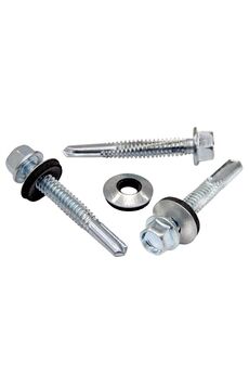 Оцинкованные саморезы с полимерным покрытием, шестигранной головкой и уплотнительной шайбой для надёжного и герметичного крепления кровли.