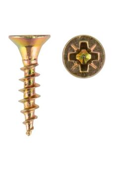 Универсальные саморезы с желтым покрытием и потайной головкой для прочного монтажа дерева, гипсокартона и пластика без предварительного сверления.