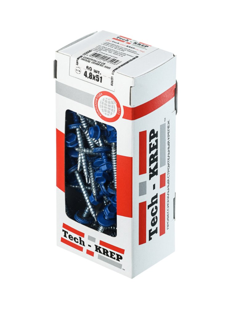 Саморез кровельный Tech-Krep 4,8х51 мм, RAL-5005 (синий), 60 шт. в коробке с окном. Для крепления кровли, антикоррозийное покрытие, герметичность.