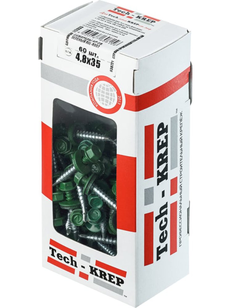Саморезы КР с диаметром 4,8 мм и длиной 35 мм в зелёном цвете (RAL-6002) от Tech-Krep предназначены для крепления различных элементов кровли и фасадов. Изготовлены из высококачественной углеродистой стали с антикоррозийным покрытием, что обеспечивает долговечность и надежность соединений даже в условиях повышенной влажности. В комплекте 60 штук, упакованы в удобную коробку с окном для контроля количества. Шестигранная головка обеспечивает удобство монтажа с помощью шуруповерта или гайковерта. Подходят для работы с металлическими профилями и деревянными конструкциями при условии предварительного сверления.