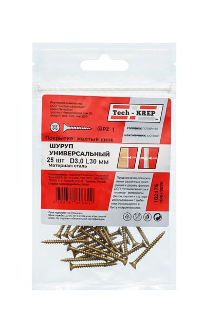 Саморез универс. желтый 3,0х30 пот. гол. (25 шт) - пакет Tech-Krep в Вяземский