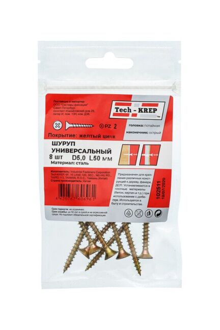 Саморез универс. желтый 5,0х50 пот. гол. (8 шт) - пакет Tech-Krep в Вяземский