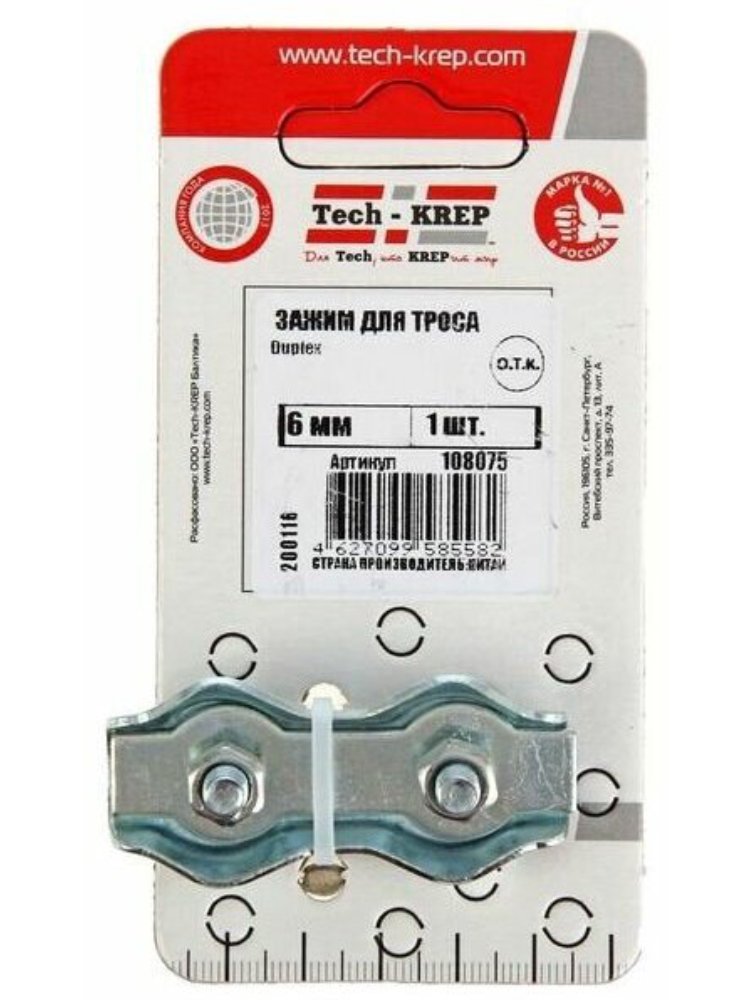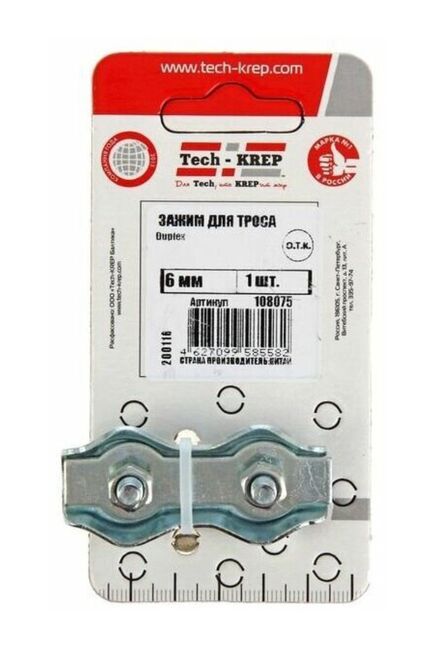 Зажим для троса Duplex 6 мм от Tech-Krep представляет собой надежное крепежное изделие, предназначенное для фиксации и соединения стальных тросов диаметром до 6 мм. Изготовлен из прочной оцинкованной стали, что обеспечивает устойчивость к коррозии и долговечность даже в условиях повышенной влажности. Конструкция зажима типа Duplex гарантирует прочное и безопасное соединение, исключая проскальзывание троса при нагрузке. В комплекте поставляется 1 штука, что удобно для точечного применения в небольших проектах. Подходит как для профессионального, так и для бытового использования.