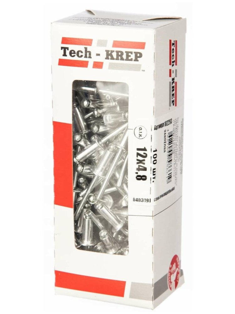 Заклепка 4,8х12 мм в упаковке 100 штук от Tech-Krep – это надежное крепежное изделие, предназначенное для создания неразъемных соединений различных материалов. Изготовлена из высококачественного алюминия и стали с оцинкованным покрытием, что обеспечивает устойчивость к коррозии и долговечность. Диаметр заклепки 4,8 мм и длина 12 мм подходят для скрепления листовых материалов толщиной до 8 мм. Упаковка в виде коробки с окном позволяет легко оценить содержимое и удобно хранить крепеж. Монтаж производится с помощью заклепочного инструмента, что гарантирует быстроту и прочность соединения.
