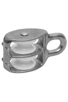 Блок грузовой с двумя нейлоновыми кольцами-шкивами. Имеет дугообразное кольцо в монолите с самим корпусом для крепления крюка или карабина. Такелажный блок применяется в грузоподъёмных конструкциях, для погрузки – подъёма, спуска груза. Используется для изменения вектора движения не стального троса для увеличения силовой тяги в грузоподъёмном механизме, при тяговом усилии на подъём. Двойной нейлоновый блок 25 мм для кабелей и грузов, обеспечивает плавный ход, стойкость к износу и простоту монтажа в строительстве и быту.