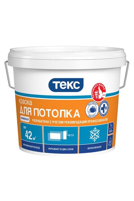 Для окраски потолков и верхних панелей стен внутри сухих помещений по бетонным, оштукатуренным, гипсокартонным, кирпичным и деревянным поверхностям. Глубокоматовая. Время высыхания 1,5 часа. Следующий слой можно наносить через 1,5 часа. Расход 5-7 м²/кг (8-10 м²/л) по ровной невпитывающей поверхности; 4-6 м²/кг (6-9 м²/л) по неровной впитывающей поверхности. Разбавитель - вода. Матовое белое покрытие для потолков, без запаха, быстро сохнет, легко наносится, подходит для жилых и детских помещений.