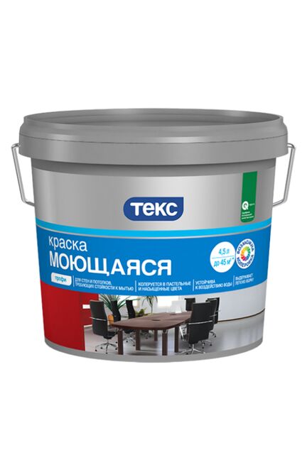 Для окраски стен и потолков внутри сухих помещений и помещений с повышенной влажностью (кухни, ванные, коридоры и др.) по бетонным, оштукатуренным, гипсокартонным, кирпичным, деревянным поверхностям, а также для обоев под окраску. Глубокоматовый. Расход 9-11 м²/л по ровной невпитывающей поверхности; 7-9 м²/л по неровной впитывающей поверхности. Время высыхания 1 час. Следующий слой можно наносить через 1,5 часа. Разбавитель - вода. Моющаяся, износостойкая краска для колеровки и влажных помещений. Легко наносится, до 36 м²/4,5 л, устойчивая к мытью и бытовой химии.