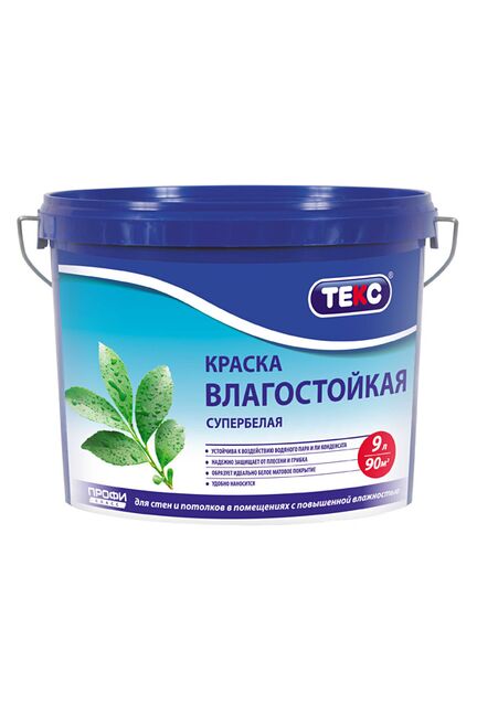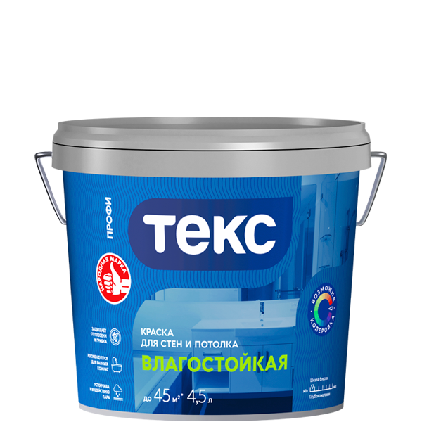 Влагостойкая, белоснежная краска с износостойкой матовой текстурой для стен и потолков в помещениях с повышенной влажностью, объем 4,5 л.