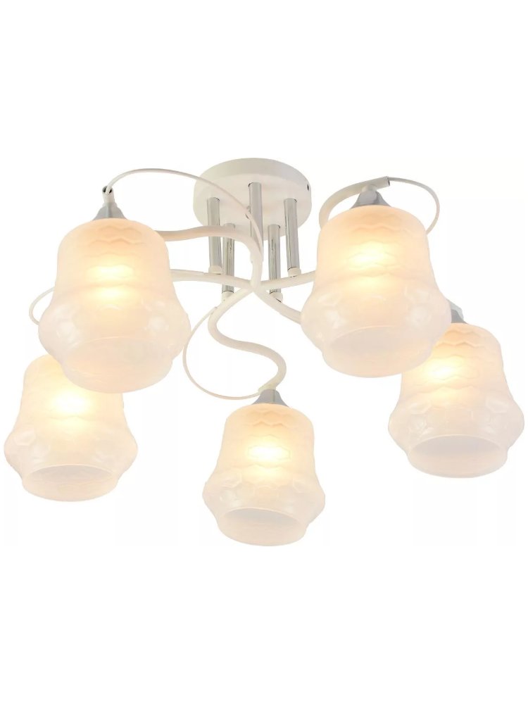Размеры: (Д*Ш*В) 520*520*270 мм Современная люстра на 5 ламп E27, белый с хромом, идеальна для гостиной или кухни. Стиль, универсальность, простота монтажа, до 60 Вт на лампу.