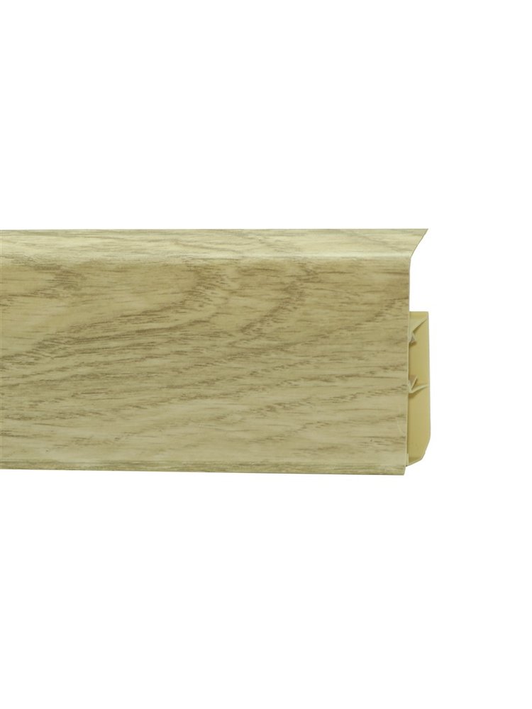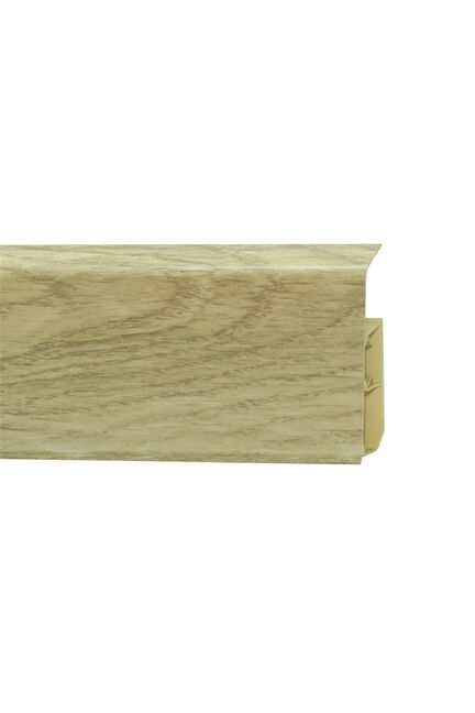 Утонченный и высокий профиль (80 мм) с острыми краями. Благодаря съёмной панели монтаж электрических проводов, покраска стен, оклеивание обоями возможны без демонтажа профилей. Конструкция позволяет монтировать и демонтировать плинтус без использования инструментов. Существует возможность размещения большого количества проводов, в том числе после монтажа. Специальная двухслойная технология: помимо слоя краски, дополнительно покрывается специальным лаком, благодаря чему его покрытие становится однородным, а это дополнительно защищает изделие от разного вида механических повреждений и вредного воздействия лучей УФ. Благодаря эластичному материалу, плинтус идеально прилегает даже к неровностям стен и полов. Высокий плинтус с текстурой дуба, длина 2,2 м, скрытый кабель-канал, износостойкое покрытие, легкий монтаж, для любого типа помещений.