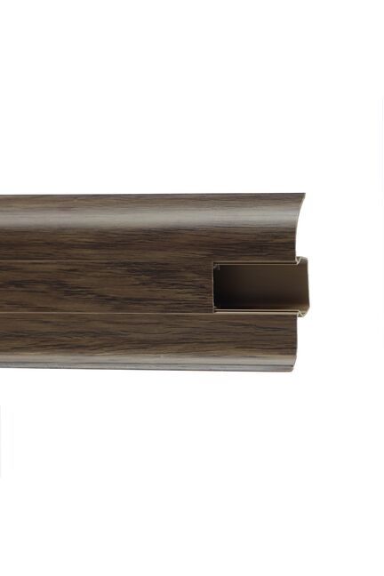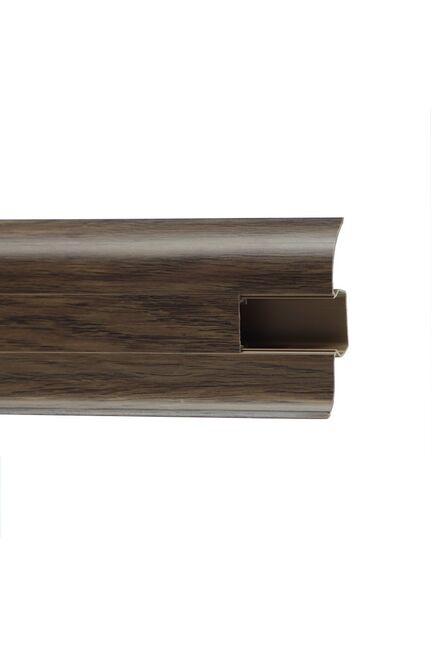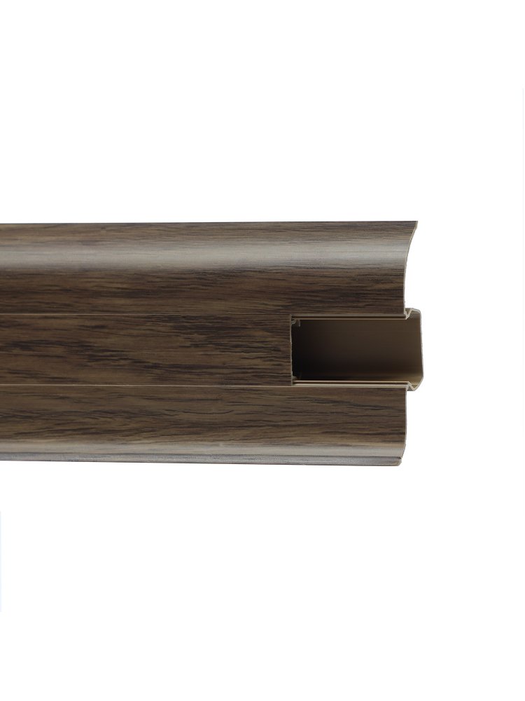 Утонченный и высокий профиль (58 мм) с острыми краями. Благодаря съёмной панели монтаж электрических проводов, покраска стен, оклеивание обоями возможны без демонтажа профилей. Конструкция позволяет монтировать и демонтировать плинтус без использования инструментов. Существует возможность размещения большого количества проводов, в том числе после монтажа. Специальная двухслойная технология: помимо слоя краски, дополнительно покрывается специальным лаком, благодаря чему его покрытие становится однородным, а это дополнительно защищает изделие от разного вида механических повреждений и вредного воздействия лучей УФ. Благодаря эластичному материалу, плинтус идеально прилегает даже к неровностям стен и полов. ПВХ-плинтус 58 мм, 2,5 м, влагостойкий, с кабель-каналом, легко монтируется, устойчив к повреждениям, подходит для любых покрытий пола.