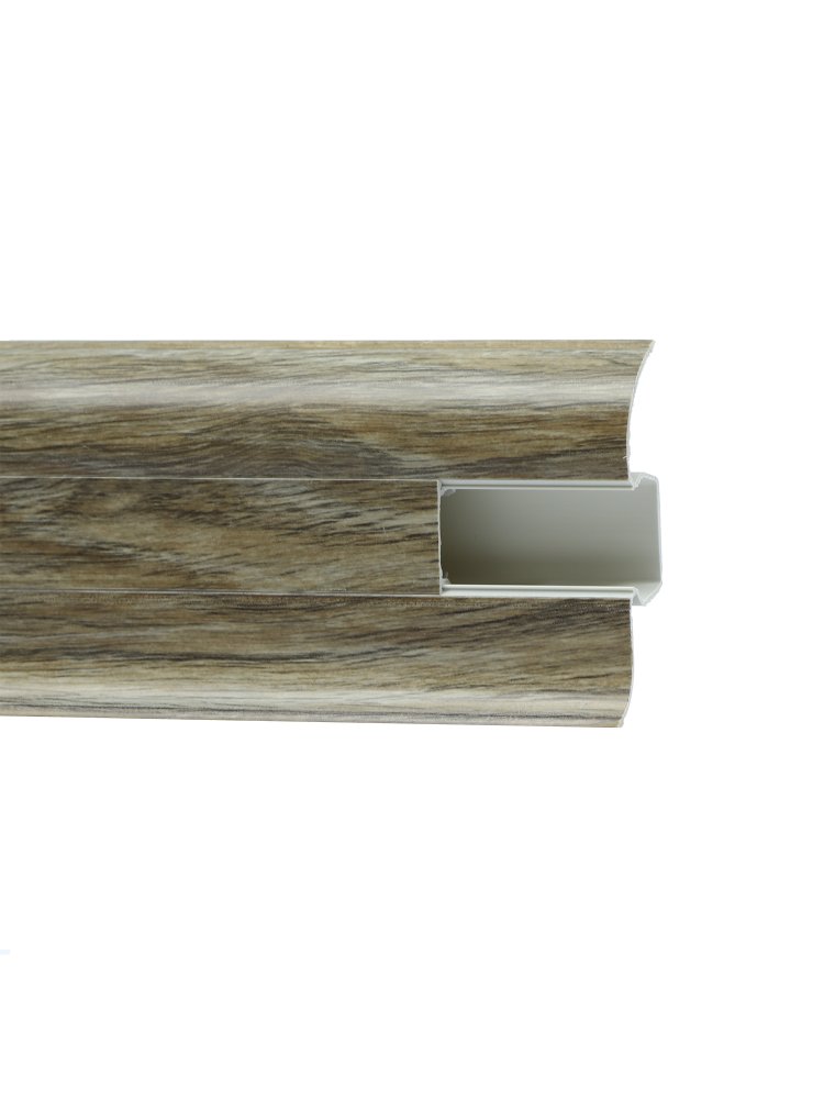 Утонченный и высокий профиль (58 мм) с острыми краями. Благодаря съёмной панели монтаж электрических проводов, покраска стен, оклеивание обоями возможны без демонтажа профилей. Конструкция позволяет монтировать и демонтировать плинтус без использования инструментов. Существует возможность размещения большого количества проводов, в том числе после монтажа. Специальная двухслойная технология: помимо слоя краски, дополнительно покрывается специальным лаком, благодаря чему его покрытие становится однородным, а это дополнительно защищает изделие от разного вида механических повреждений и вредного воздействия лучей УФ. Благодаря эластичному материалу, плинтус идеально прилегает даже к неровностям стен и полов. Плинтус ПВХ 58мм, 2,5м, влагостойкий, с каналом для кабеля, под дуб, легко монтируется и защищает стыки пола и стен.