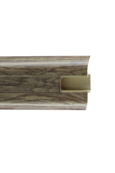 Утонченный и высокий профиль (58 мм) с острыми краями. Благодаря съёмной панели монтаж электрических проводов, покраска стен, оклеивание обоями возможны без демонтажа профилей. Конструкция позволяет монтировать и демонтировать плинтус без использования инструментов. Существует возможность размещения большого количества проводов, в том числе после монтажа. Специальная двухслойная технология: помимо слоя краски, дополнительно покрывается специальным лаком, благодаря чему его покрытие становится однородным, а это дополнительно защищает изделие от разного вида механических повреждений и вредного воздействия лучей УФ. Благодаря эластичному материалу, плинтус идеально прилегает даже к неровностям стен и полов. Плинтус 58 мм PVC, цвет акация винтажная, скрытая укладка кабелей, влагостойкий, прост в монтаже, длина 2,2 м, имитация дерева.