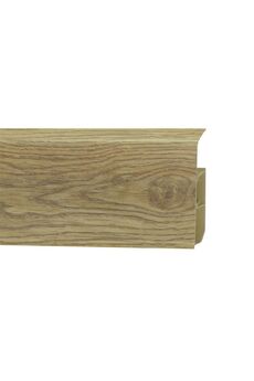 Утонченный и высокий профиль (58 мм) с острыми краями. Благодаря съёмной панели монтаж электрических проводов, покраска стен, оклеивание обоями возможны без демонтажа профилей. Конструкция позволяет монтировать и демонтировать плинтус без использования инструментов. Существует возможность размещения большого количества проводов, в том числе после монтажа. Специальная двухслойная технология: помимо слоя краски, дополнительно покрывается специальным лаком, благодаря чему его покрытие становится однородным, а это дополнительно защищает изделие от разного вида механических повреждений и вредного воздействия лучей УФ. Благодаря эластичному материалу, плинтус идеально прилегает даже к неровностям стен и полов. Эстетичный влагостойкий плинтус 58 мм, с кабель-каналом, в цвете дуб — для надёжной защиты и стильного оформления стыка пола и стены.