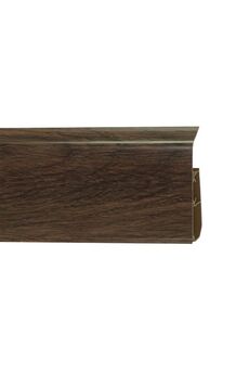 Утонченный и высокий профиль (58 мм) с острыми краями. Благодаря съёмной панели монтаж электрических проводов, покраска стен, оклеивание обоями возможны без демонтажа профилей. Конструкция позволяет монтировать и демонтировать плинтус без использования инструментов. Существует возможность размещения большого количества проводов, в том числе после монтажа. Специальная двухслойная технология: помимо слоя краски, дополнительно покрывается специальным лаком, благодаря чему его покрытие становится однородным, а это дополнительно защищает изделие от разного вида механических повреждений и вредного воздействия лучей УФ. Благодаря эластичному материалу, плинтус идеально прилегает даже к неровностям стен и полов. Плинтус 58 мм PVC, цвет акация винтажная, скрытая укладка кабелей, влагостойкий, прост в монтаже, длина 2,2 м, имитация дерева.