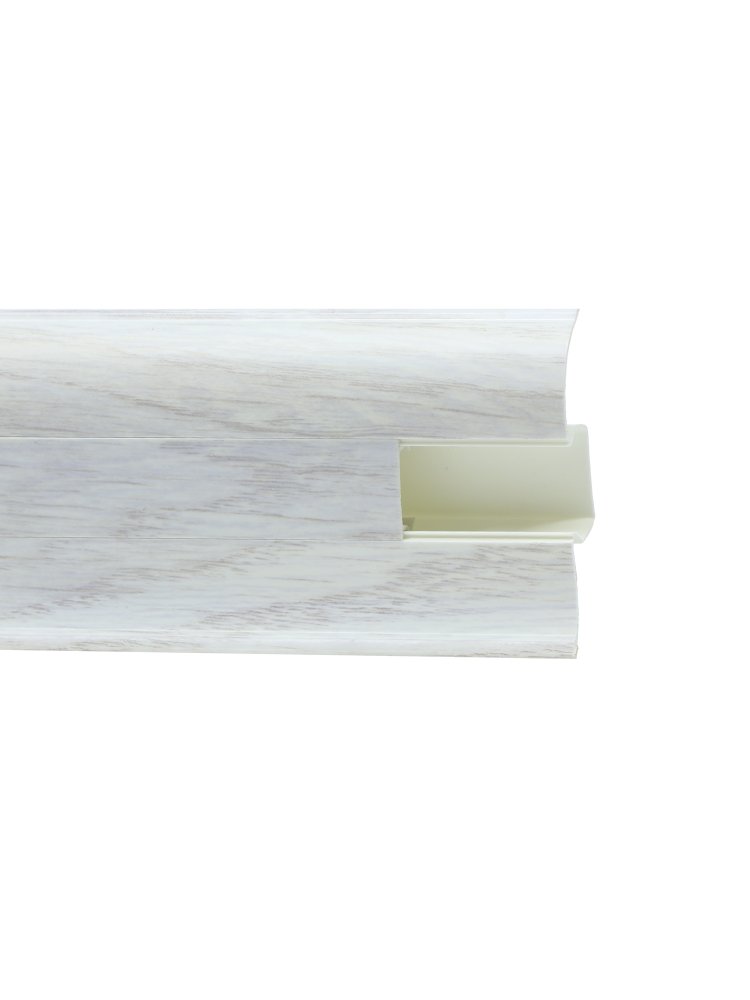 Утонченный и высокий профиль (58 мм) с острыми краями. Благодаря съёмной панели монтаж электрических проводов, покраска стен, оклеивание обоями возможны без демонтажа профилей. Конструкция позволяет монтировать и демонтировать плинтус без использования инструментов. Существует возможность размещения большого количества проводов, в том числе после монтажа. Специальная двухслойная технология: помимо слоя краски, дополнительно покрывается специальным лаком, благодаря чему его покрытие становится однородным, а это дополнительно защищает изделие от разного вида механических повреждений и вредного воздействия лучей УФ. Благодаря эластичному материалу, плинтус идеально прилегает даже к неровностям стен и полов. Стильный плинтус 58 мм, дуб, 2,5 м: для аккуратной отделки, защиты стен и скрытия проводов, износостойкий, влагостойкий, реалистичная фактура.