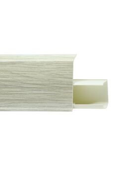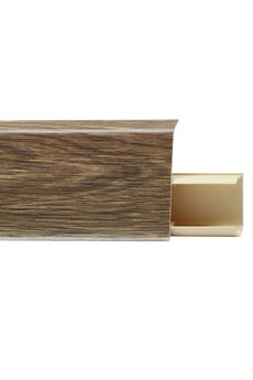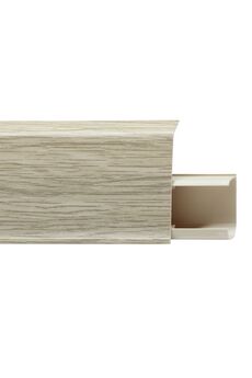 Утонченный и высокий профиль (58 мм) с острыми краями. Благодаря съёмной панели монтаж электрических проводов, покраска стен, оклеивание обоями возможны без демонтажа профилей. Конструкция позволяет монтировать и демонтировать плинтус без использования инструментов. Существует возможность размещения большого количества проводов, в том числе после монтажа. Специальная двухслойная технология: помимо слоя краски, дополнительно покрывается специальным лаком, благодаря чему его покрытие становится однородным, а это дополнительно защищает изделие от разного вида механических повреждений и вредного воздействия лучей УФ. Благодаря эластичному материалу, плинтус идеально прилегает даже к неровностям стен и полов. Износостойкий плинтус 58 мм с каналом для кабеля, длина 2,5 м, влагоустойчив, дизайн под дуб. Идеален для чистой и аккуратной отделки пола.