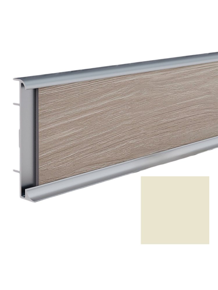 Используется для ровных стен. Имеет пазы для вставки элемента напольного покрытия. Крепится на саморезы. Умеренно гибкий. Прочный алюминиевый плинтус 60мм с покрытием RAL 1013 муар — оптимален для коммерческих полов, легко монтируется и долговечен.
