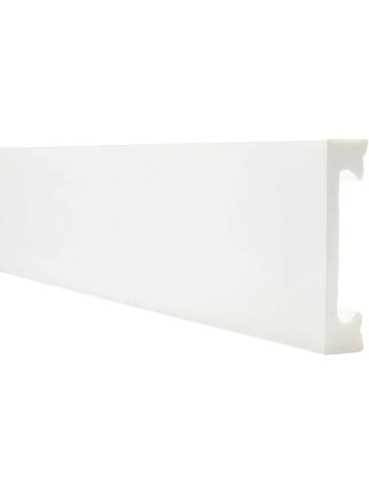 Напольный плинтус выполнен из высококачественного дюрополимера, устойчивого к ударам, влаге, грибку и бытовым повреждениям, что делает его отличным выбором для жилых и коммерческих помещений любого типа.
