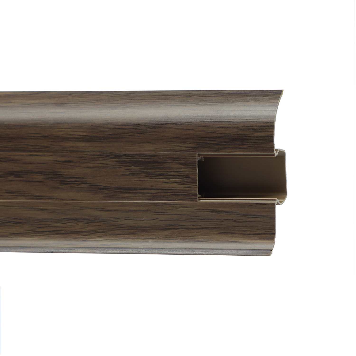 Утонченный и высокий профиль (58 мм) с острыми краями. Благодаря съёмной панели монтаж электрических проводов, покраска стен, оклеивание обоями возможны без демонтажа профилей. Конструкция позволяет монтировать и демонтировать плинтус без использования инструментов. Существует возможность размещения большого количества проводов, в том числе после монтажа. Специальная двухслойная технология: помимо слоя краски, дополнительно покрывается специальным лаком, благодаря чему его покрытие становится однородным, а это дополнительно защищает изделие от разного вида механических повреждений и вредного воздействия лучей УФ. Благодаря эластичному материалу, плинтус идеально прилегает даже к неровностям стен и полов.