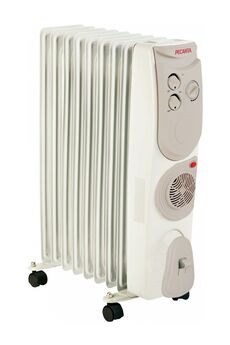 Масляный радиатор предназначен для обогрева воздуха в помещениях площадью до 25 квадратных метров. Термостат регулируется вручную при помощи удобной ручки. Переключение режимов обогрева осуществляется удобной ручкой. Световой индикатор предназначен для контроля рабочего состояния масляного радиатора. Для удобства перемещения конструкция прибора оснащена колёсами. Эффективный обогрев до 25 м², 3 режима мощности, встроенный вентилятор, термостат, 12 секций, защита от перегрева и опрокидывания.