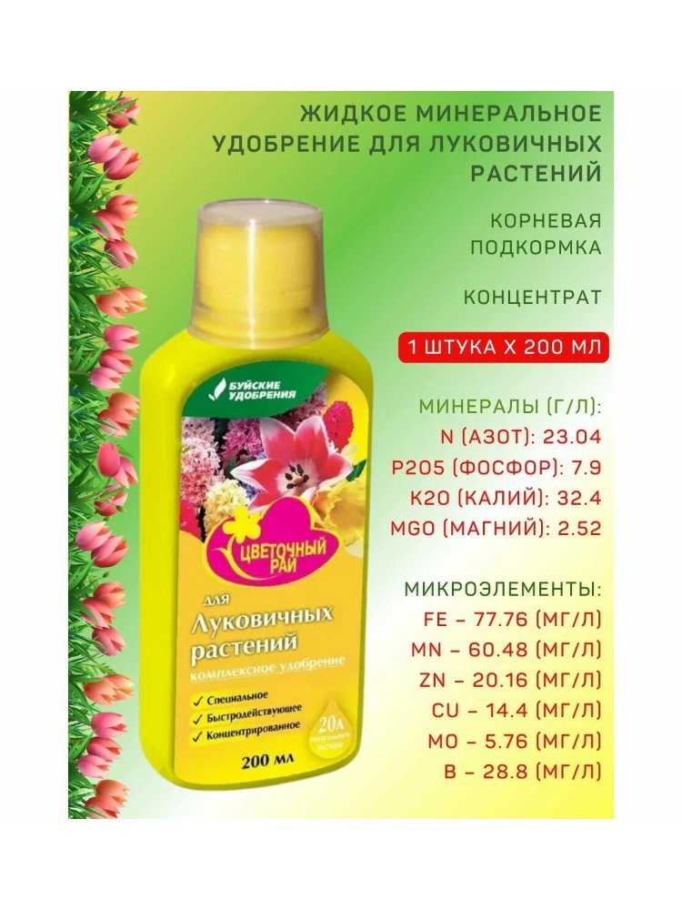 Максимальный рост и пышное цветение для всех луковичных! Концентрированное удобрение специально разработано для тюльпанов, нарциссов, гиацинтов и других луковичных растений, обеспечивая им комплексное питание. Подходит для открытого грунта, клумб, балконных и комнатных растений.