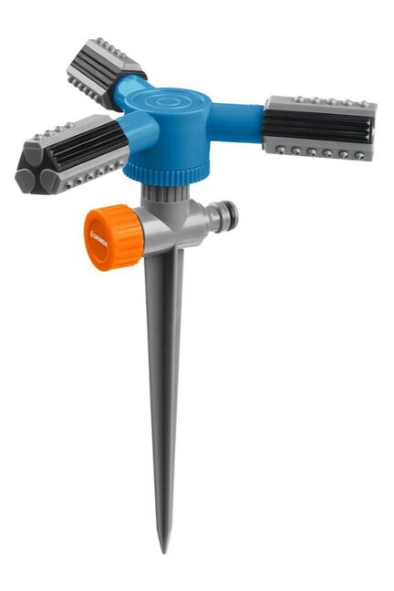 Круговой распылитель на пике для газонов и клумб, площадь полива до 113 м², долговечные материалы, удобное подключение и установка.