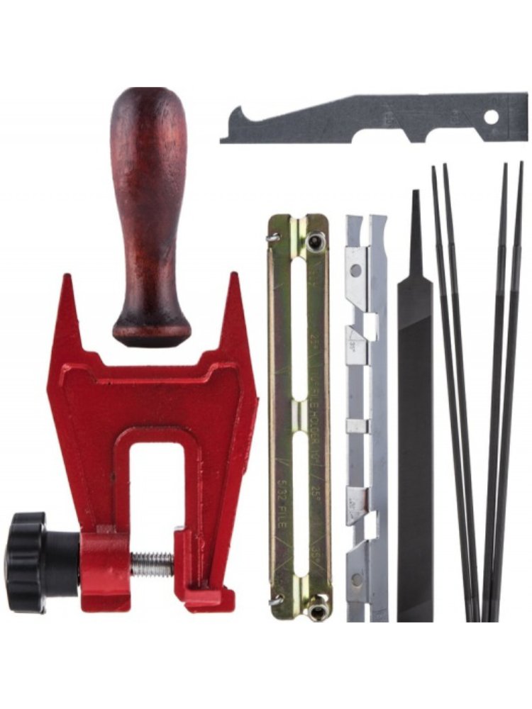 - В комплекте: напильники круглые 4,0 мм (2 шт.) и 4,8 мм (2 шт.), плоский напильник для очистки и заточки ограничителей, шаблон, планка для точности угла, универсальная рукоятка, скребок для удаления опилок, струбцина для фиксации цепи.