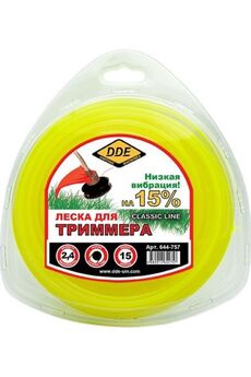 Триммерный корд DDE производится из материала сополимер-термопласт марки Luran S производимой мировым лидером, компанией BASF. Сечение-пятиконечная звезда. Корд 2,4 мм для триммеров: эффективный срез, высокая износостойкость, длина 120 м для экономичного применения.