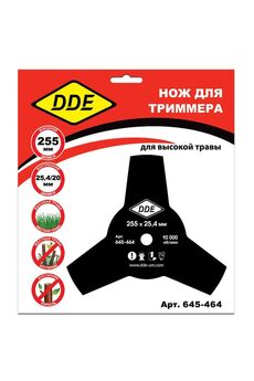 Диск для триммера DDE GRASS CUT 3-хлопастной, 255 х 25,4 мм, предназначен для кошения высокой травы. Изготовлен из углеродистой стали. Двухсторонняя заточка лезвий. Для равномерного износа рекомендуется переворачивать нож каждые 5 часов кошения. Регулярно затачивайте нож, после заточки обязательно проверяйте балансировку ножа. Рекомендуется для электрических и бензиновых триммеров с редуктором. Максимальные обороты 10 000. Толщина ножа 1,4 мм. Трёхлопастной стальной диск 255 мм, отверстие 25,4 мм для мотокос и триммеров. Эффективно режет траву и тонкие кустарники, служит долго.