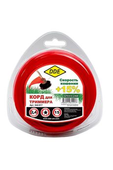 Корд триммерный Speed line DDE применяется при работе с триммерами для кошения травы. Является режущим элементом и заправляется в триммерную головку. Изготовлен из износостойкого сополимер-термопласта марки Luran S. Выдерживает интенсивную эксплуатацию на высоких оборотах. Обладает высокой скоростью кошения. Корд сечением звезда, диаметр 2,4 мм, длина 15 м, идеально режет плотную траву, повышенная износостойкость и простота эксплуатации.