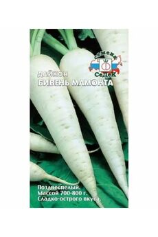 Семена с отличной всхожестью, быстрорастущий дайкон до 50 см, нежный вкус, подходит для салатов и хранения, устойчив к болезням.