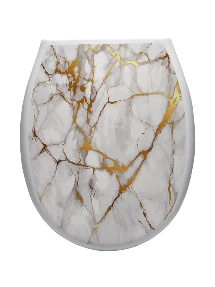 Сиденье из прочного пластика с декором под белый мрамор, легко моется, подходит к большинству унитазов, устойчива к влаге и износу.
