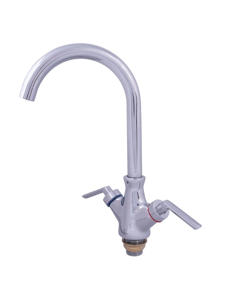 Практичный выбор для кухни в доме, кафе или офисе! Смеситель предназначен для установки на кухонную мойку, подходя для любых стандартных систем водоснабжения. Модель оснащена двумя удобными поворотными ручками регулировки подачи горячей и холодной воды, что обеспечивает точное смешивание температурного потока. Изготовлен из долговечного сплава для устойчивости к коррозии и повреждениям, легко очищается и сохраняет внешний вид в течение многих лет.