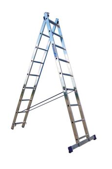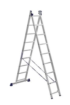 Двухсекционная алюминиевая лестница, 9 ступеней, высота 4,29 м – лёгкая, устойчивая и надёжная для работ внутри и снаружи помещений.