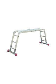 Трансформируется в лестницу, подмости и платформу. Высота площадки 150 см. Легкий алюминий, нагрузка до 150 кг. Шарнирная система для безопасности.