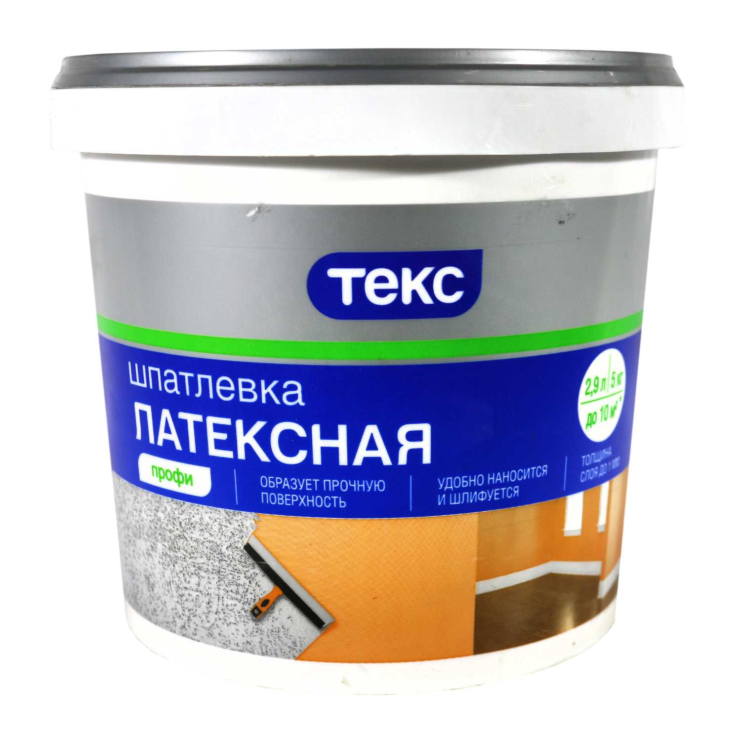 Финишная латексная шпаклёвка для идеально гладкой поверхности, устойчива к трещинам, быстро сохнет и легко наносится. Объем 5 кг.