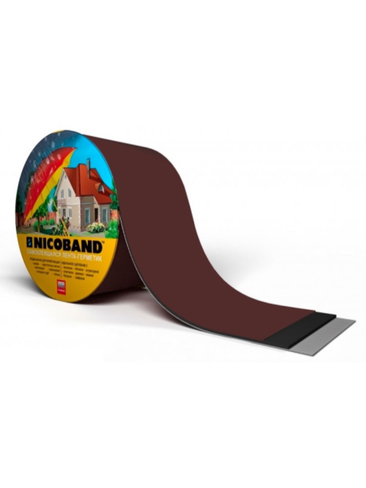 Самоклеющаяся лента марки NICOBAND предназначена для герметизации швов и трещин. Материал представляет собой трёхслойное изделие. Верхний слой – цветное покрытие с УФ-защитой. Средний представляет собой самоклеющийся герметизирующий материал. Нижняя часть – защитная пленка, которая легко отсоединяется. Лента Никобенд нашла широкое применение: материал используют для ремонта кровли, изоляции примыканий и водосточных систем. Изделие отличается хорошим сцеплением с различными материалами, включая древесину, стекло, пластик и бетон. Самоклеящаяся герметизирующая лента коричневого цвета, 3 м х 5 см. Отличается высокой адгезией, влагостойкостью и простотой применения для гидроизоляции.