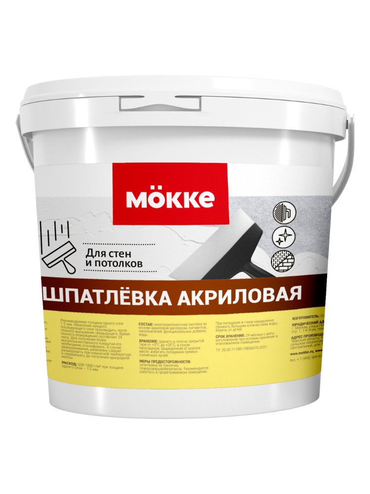 Простое и быстрое выравнивание стен и потолков внутри помещений — акриловая шпатлевка для внутренних работ 1 кг MOKKE создана для получения идеально гладкой поверхности перед отделкой. Лёгкая в нанесении, быстро сохнет, не даёт усадки и не растрескивается, подходит для бетона, гипсокартона, кирпича и отштукатуренных поверхностей.
